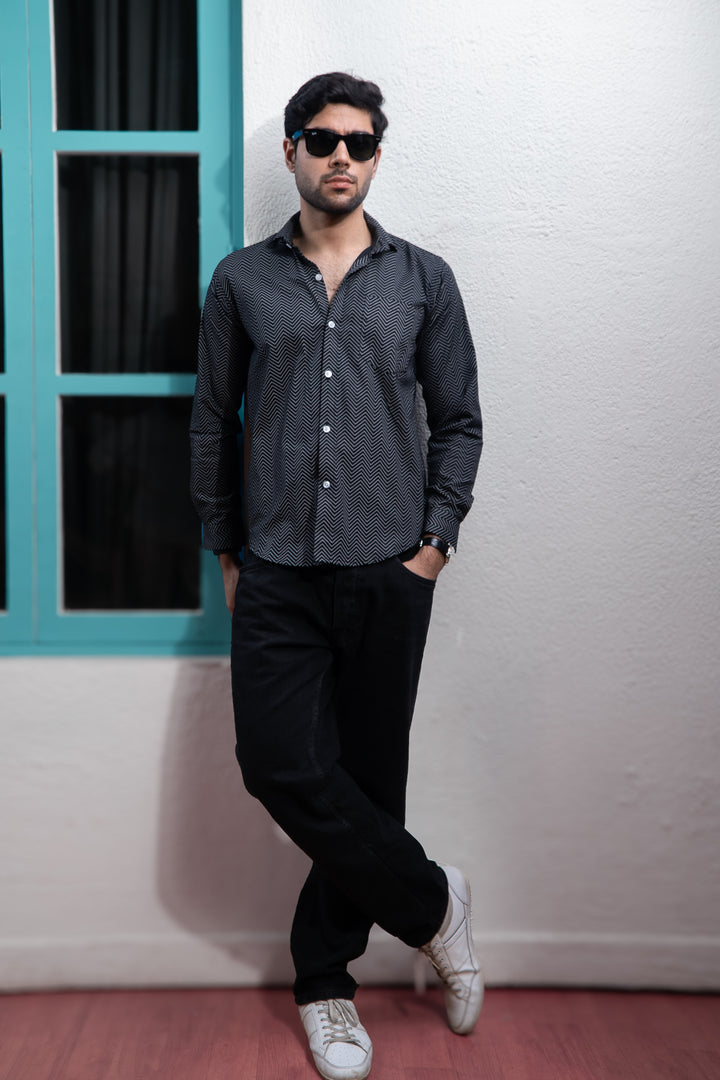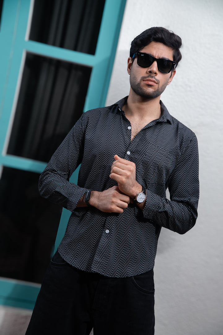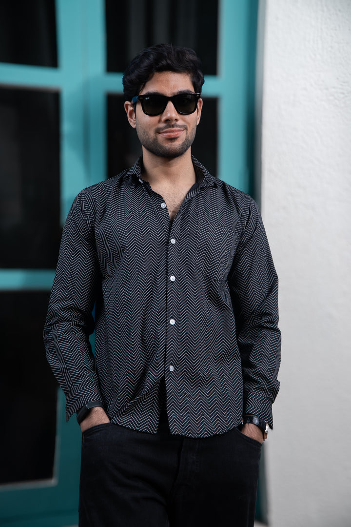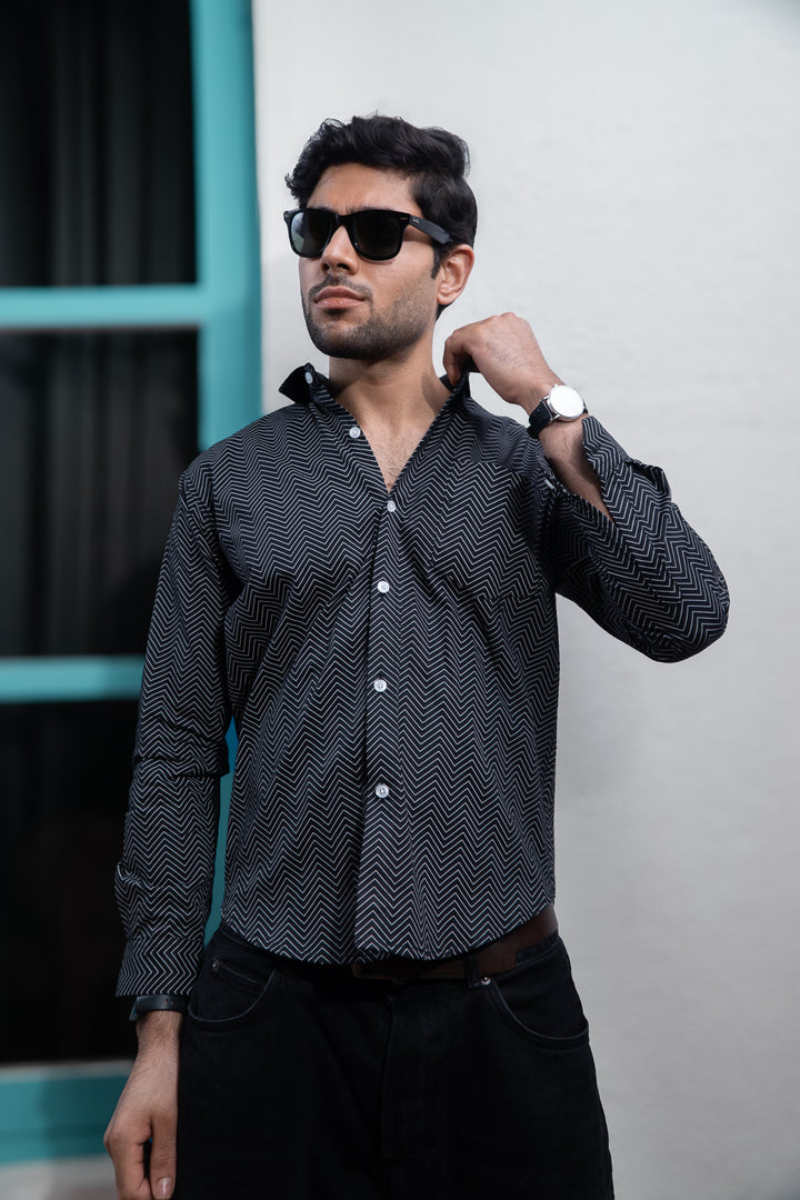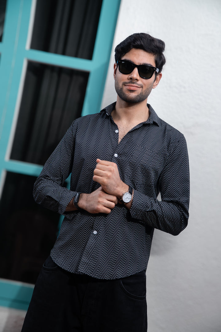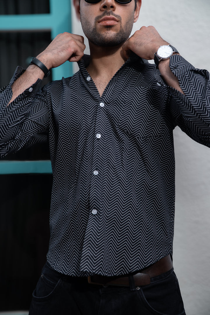 Black Symetrical Zigzag Lines Print Full Sleeves Shirt