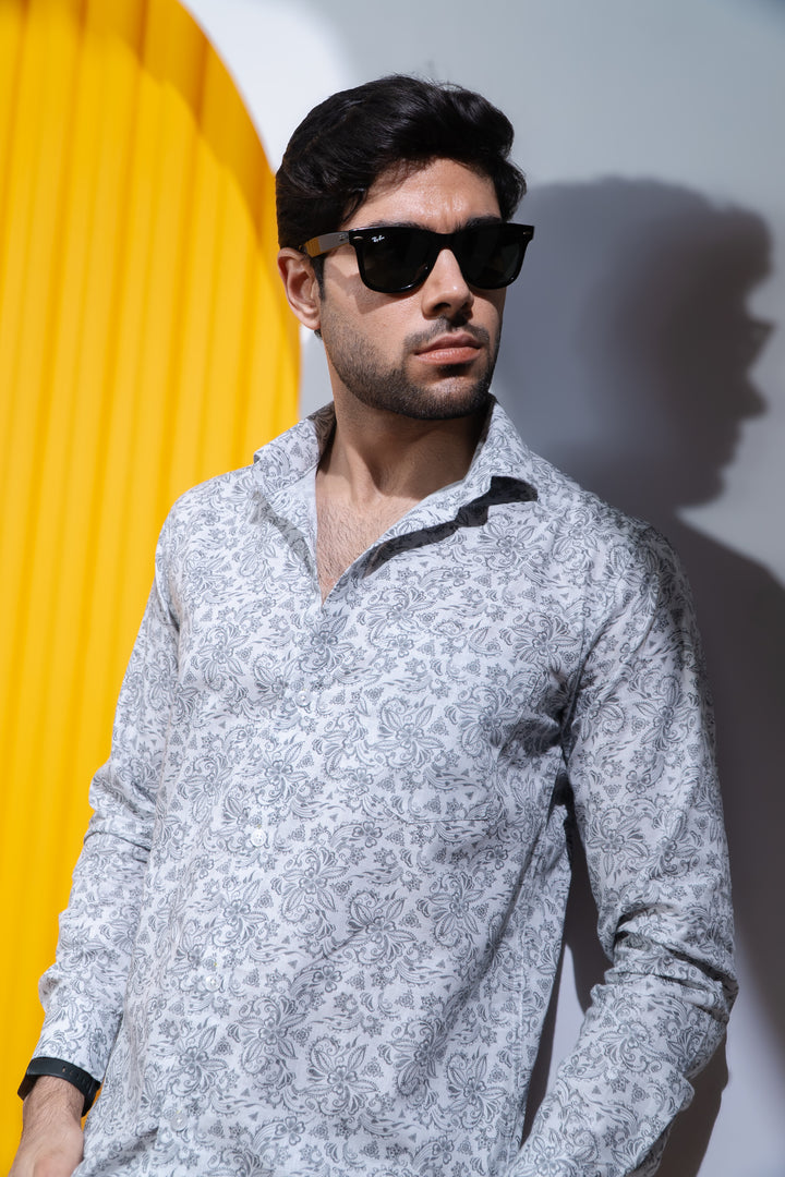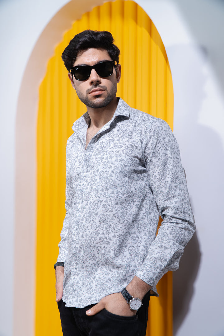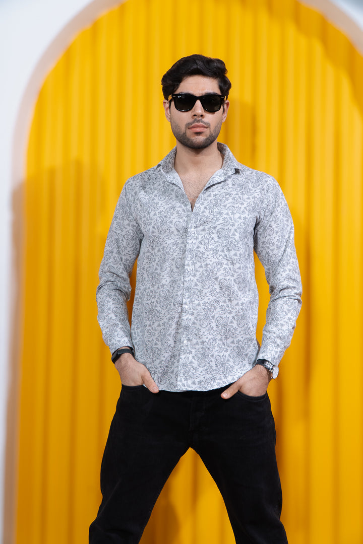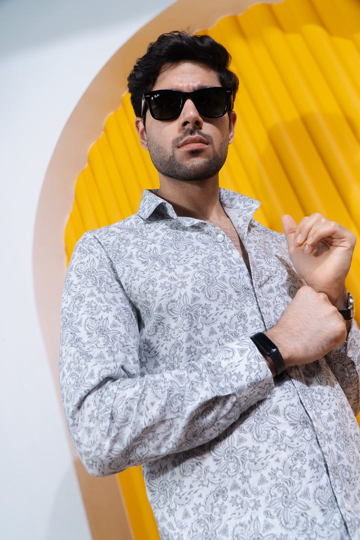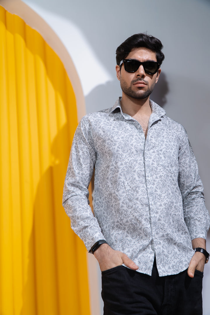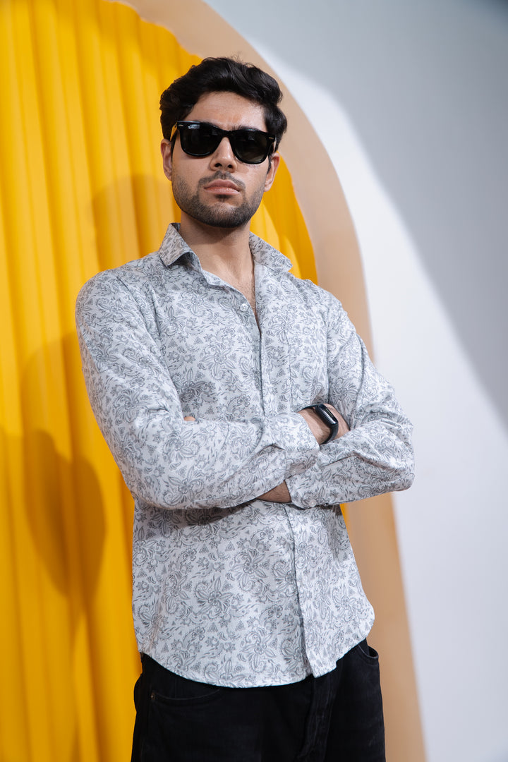 Dark Grey Floral Printed Full Sleeves Mens Shirt