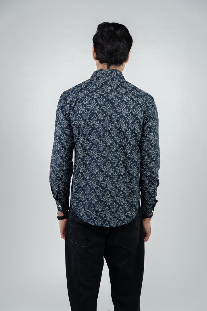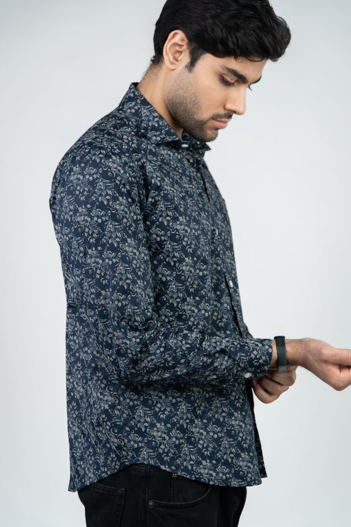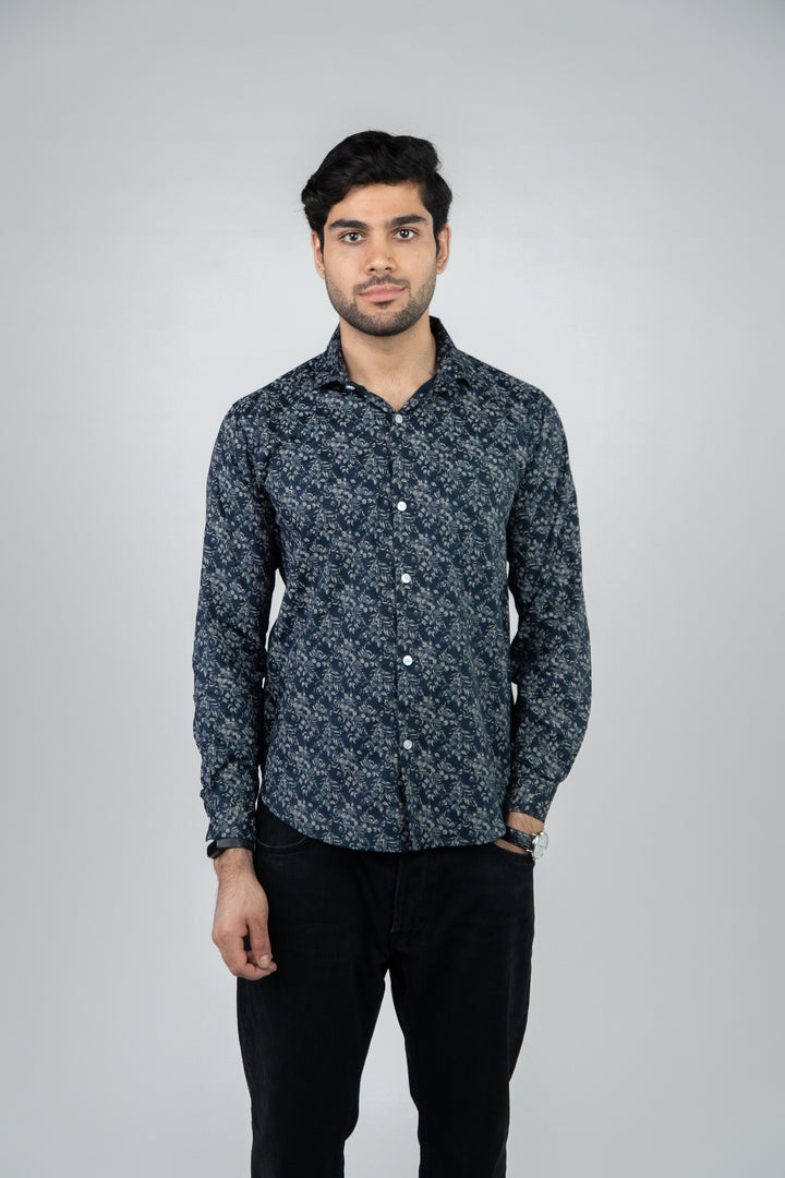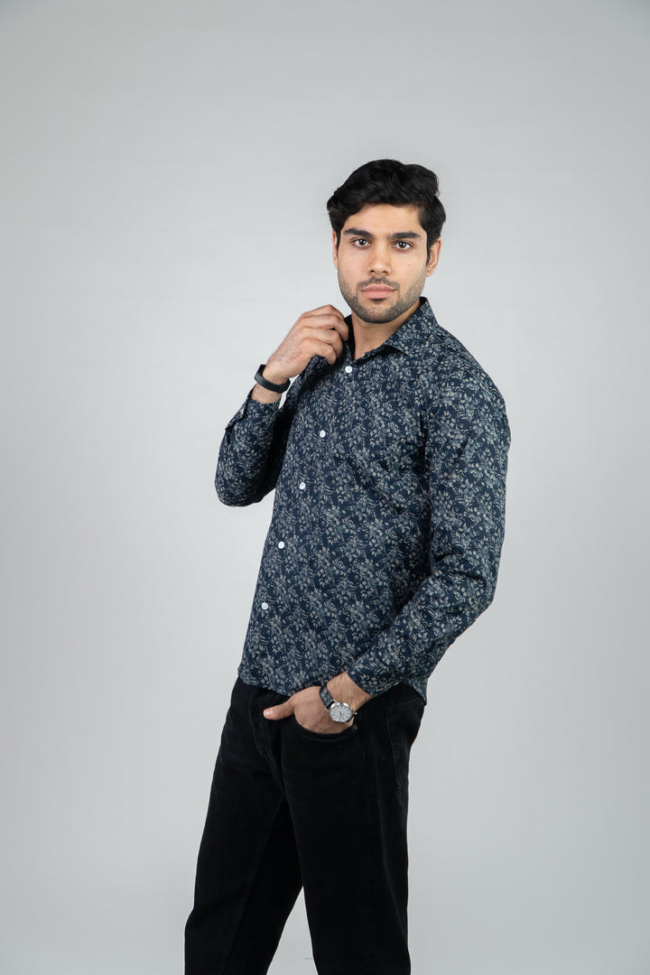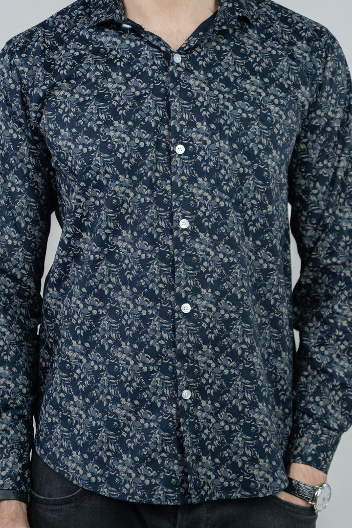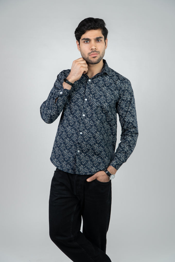 Navy Blue Floral Printed Full Sleeves Mens Shirt