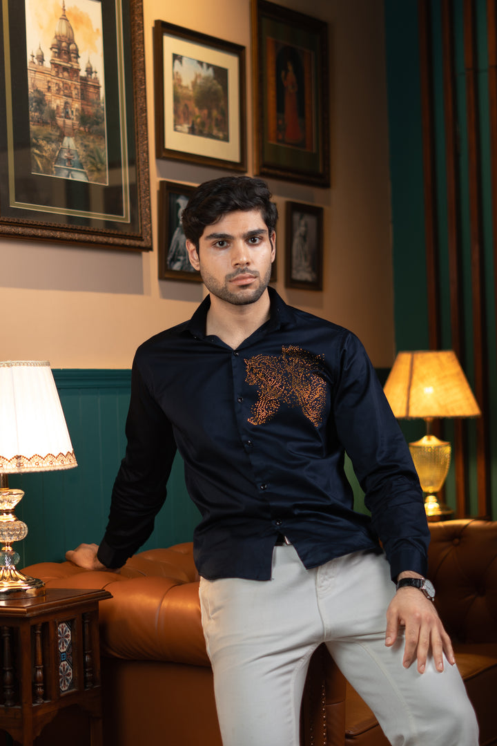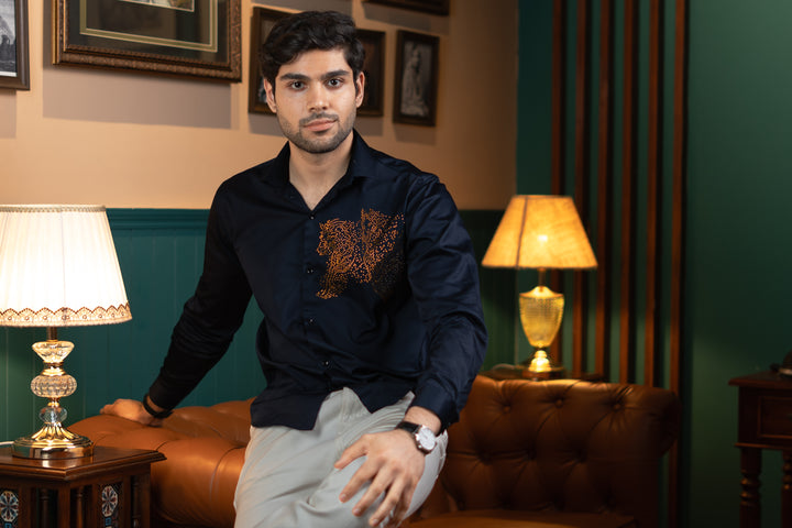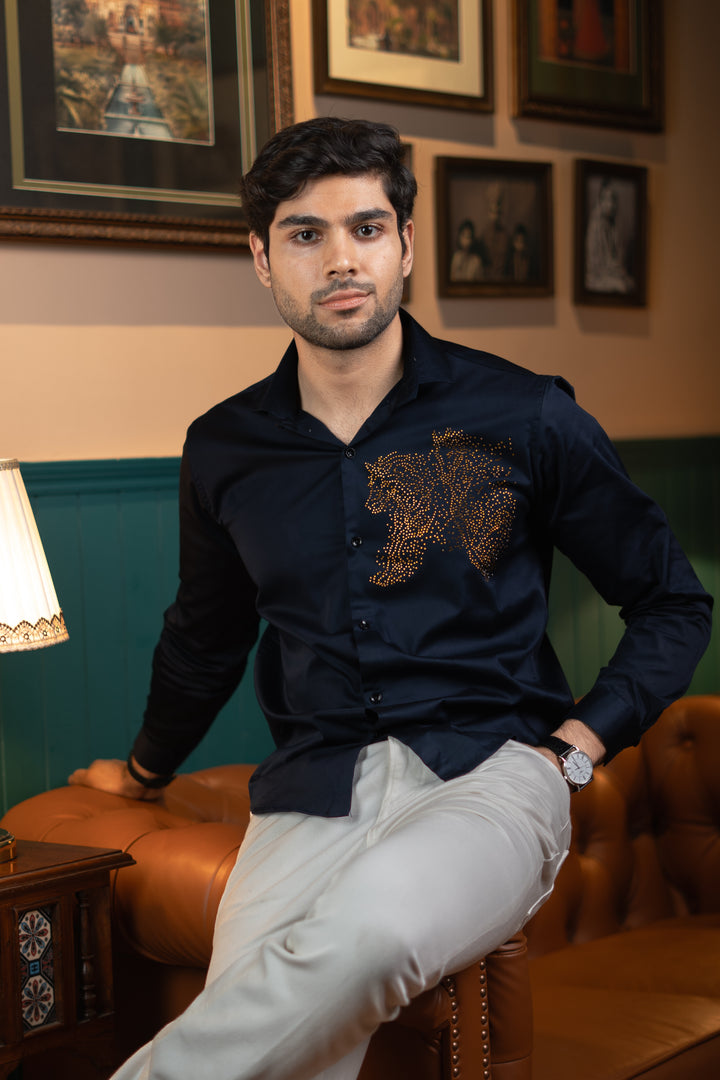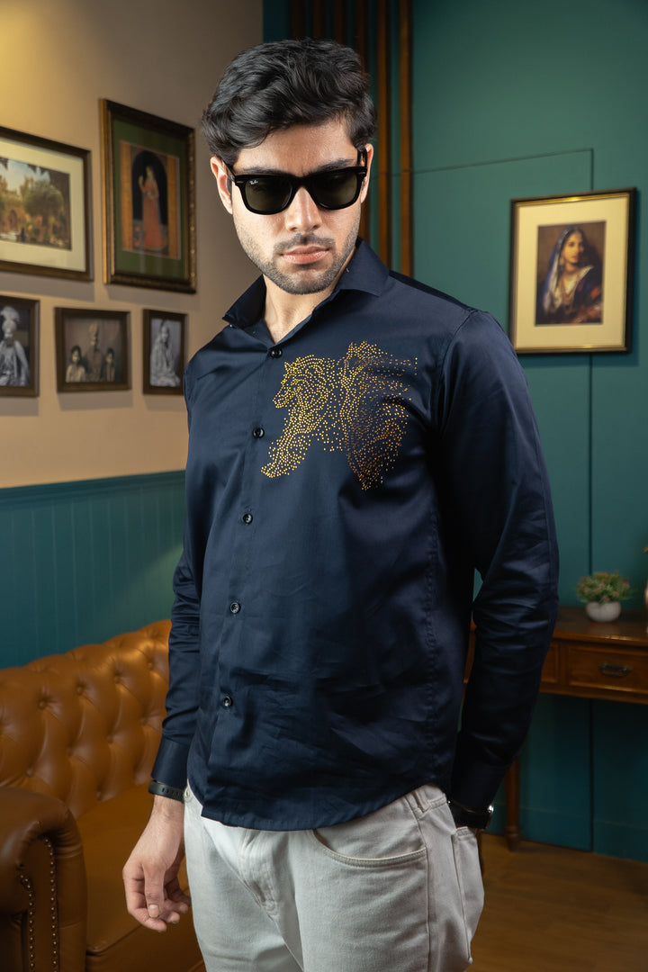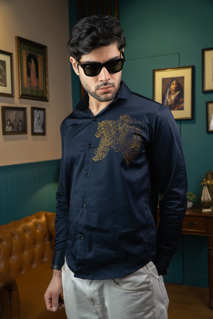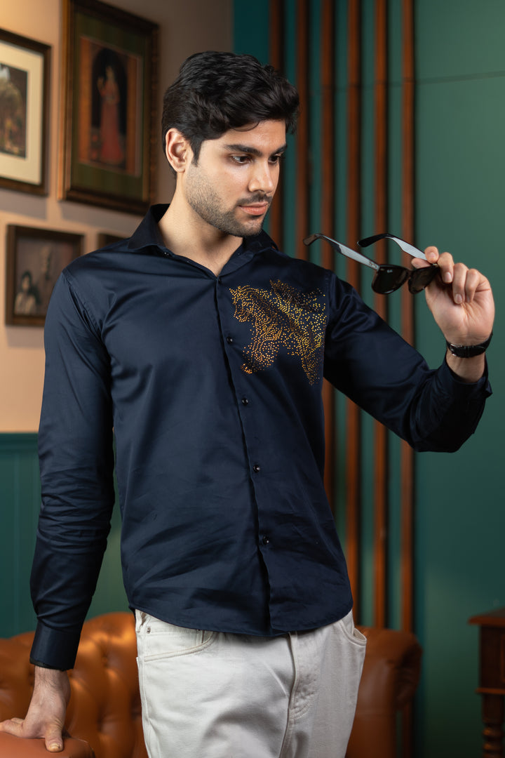 Plain Navy Blue Giza Satin Shirt with Animal-Shaped Print for Men